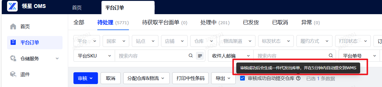 平台订单勾选【审核成功自动提交仓库】,订单分配仓库和渠道后便会自动进行审核,审核成功的订单则会是【处理中】的状态。