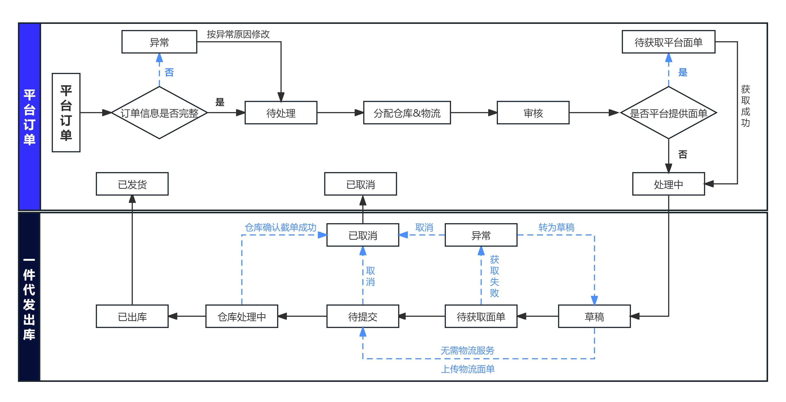 【平台订单-处理中】的订单会在一件代发生成出库单,用户可以在【仓储服务-一件代发出库-草稿-待获取面单】找到该平台订单后点击获取面单,物流商生成面单获取后状态会流转到【草稿-待提交】状态,点击提交或用户如果有勾选自动提交,订单会在待提交状态自动提交到【仓库处理中】,【仓库处理中】状态的订单代表已经将出库单预报到海外仓,接下来等待海外仓进行出库操作后,在【已出库】列表即可查看。