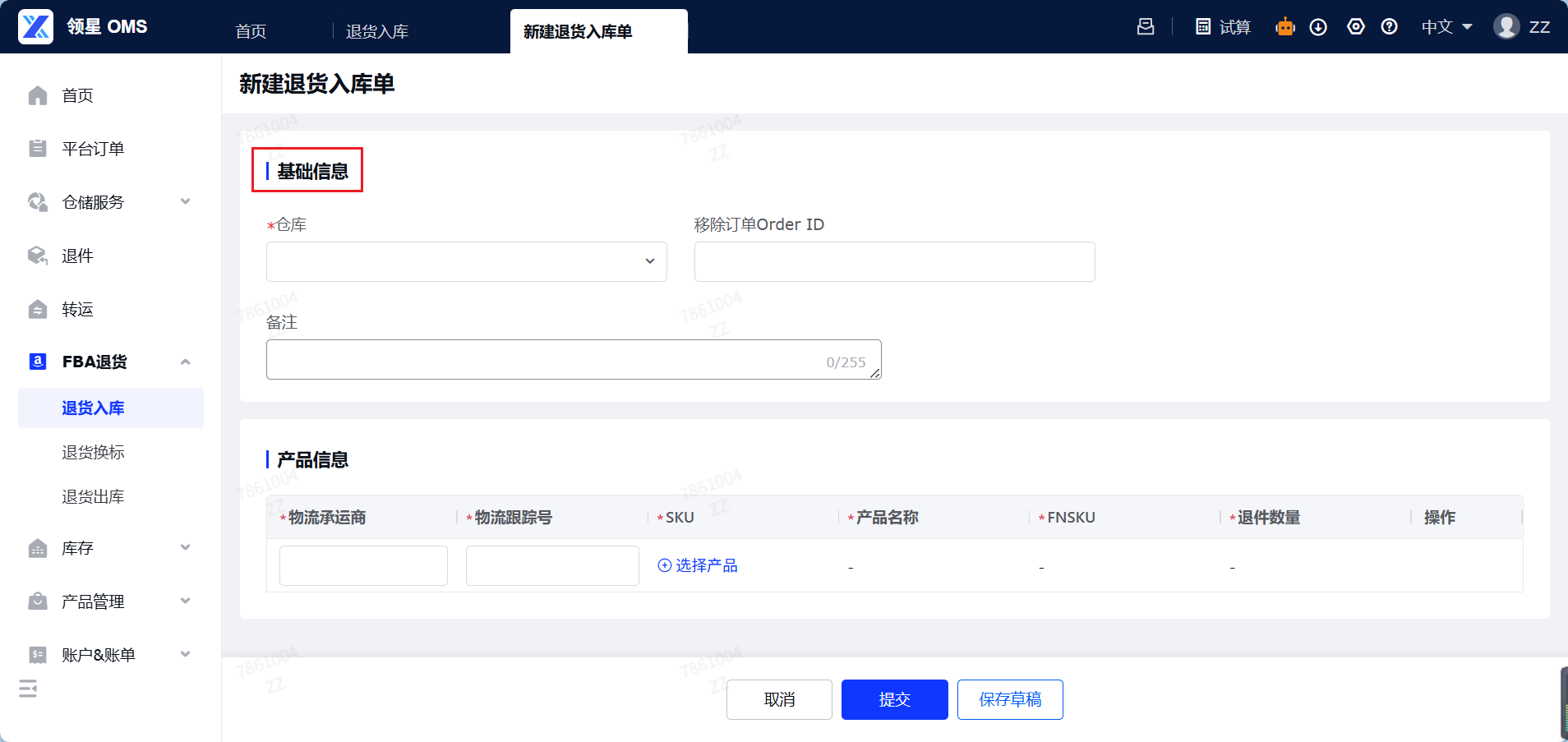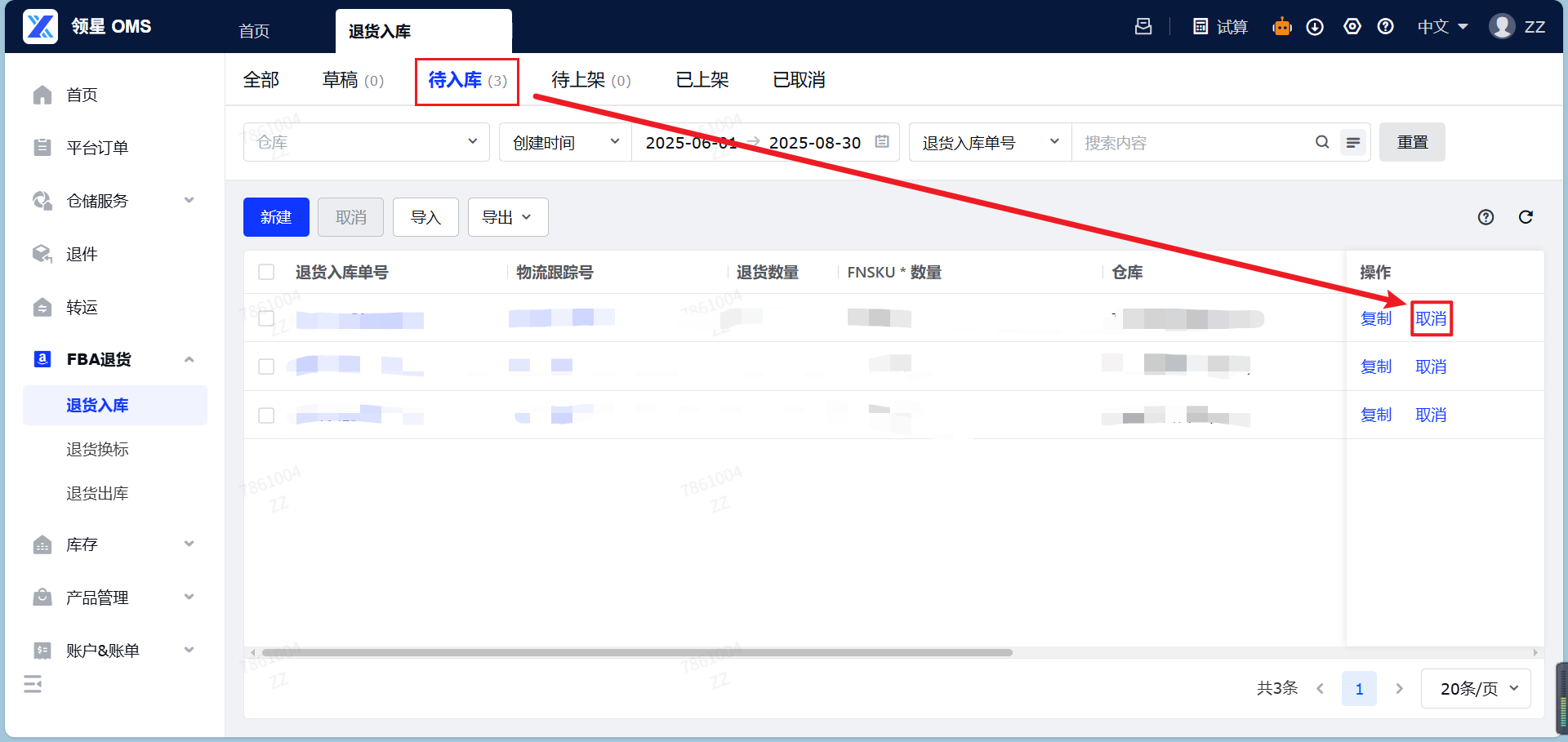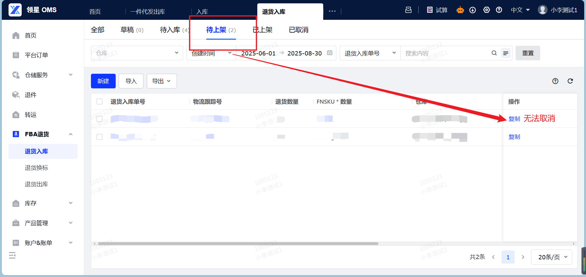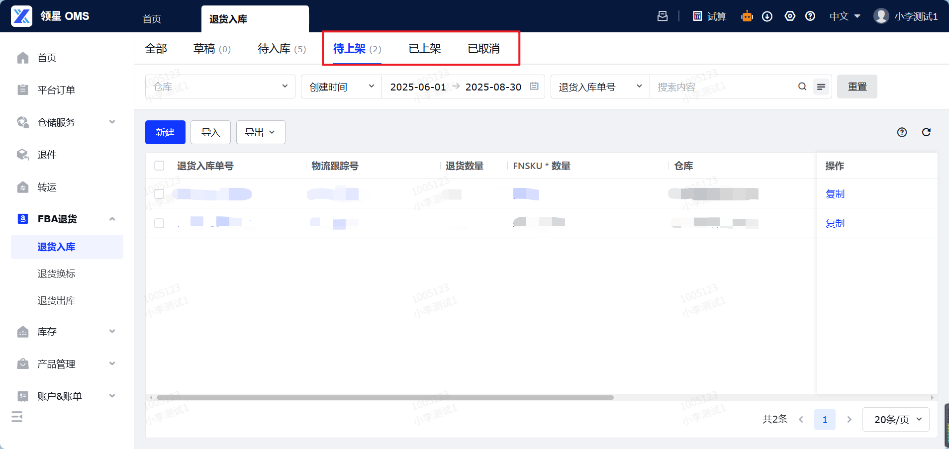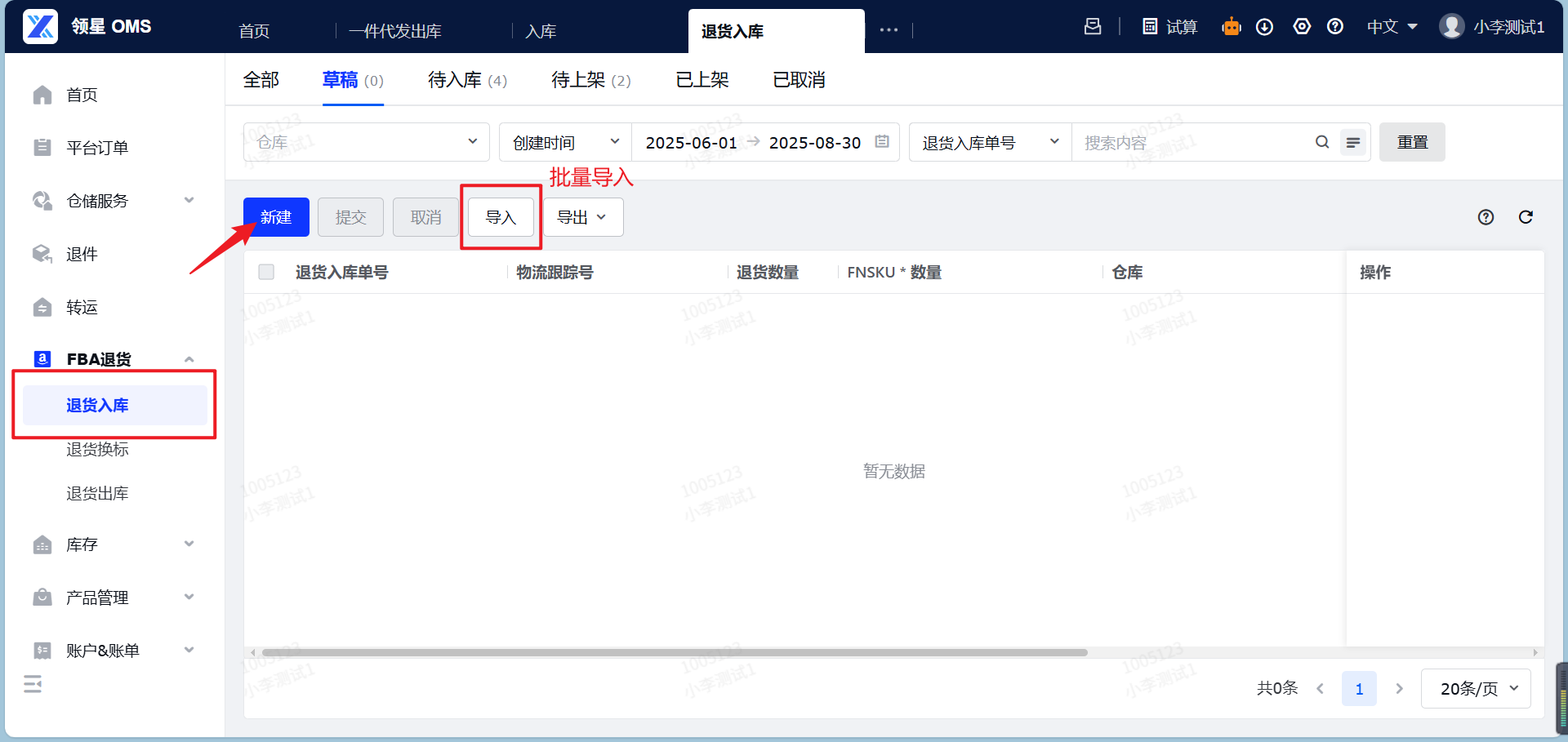 定义:FBA退货入库,就是您的亚马逊平台仓将货物退回海外仓,货物到达海外仓库之前,提前通过系统向仓库提交一份的退件的清单信息。作用:FBA退货入库板块的核心功能是创建FBA退货入库预报单,它能帮助仓库提前做好收货准备并且快速收货重新上架至您的海外仓。本章将指导您如何通过OMS系统创建FBA退货入库预报单,并完成退件的入库流程,帮您全流程追踪退货商品动向。