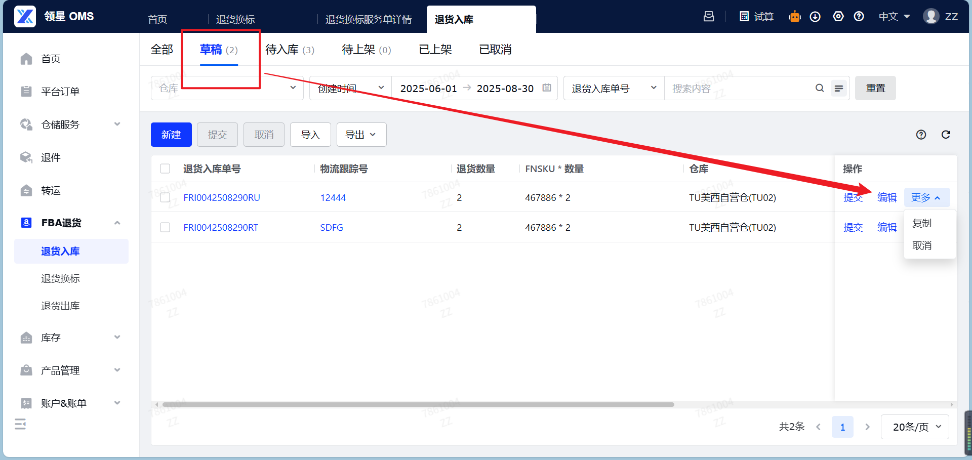 - 草稿:新建FBA退货入库单的时候点击“保存草稿”,保存成功后即为草稿状态。此时FBA退货入库单已创建但未正式提交至仓库,支持修改,取消等操作。