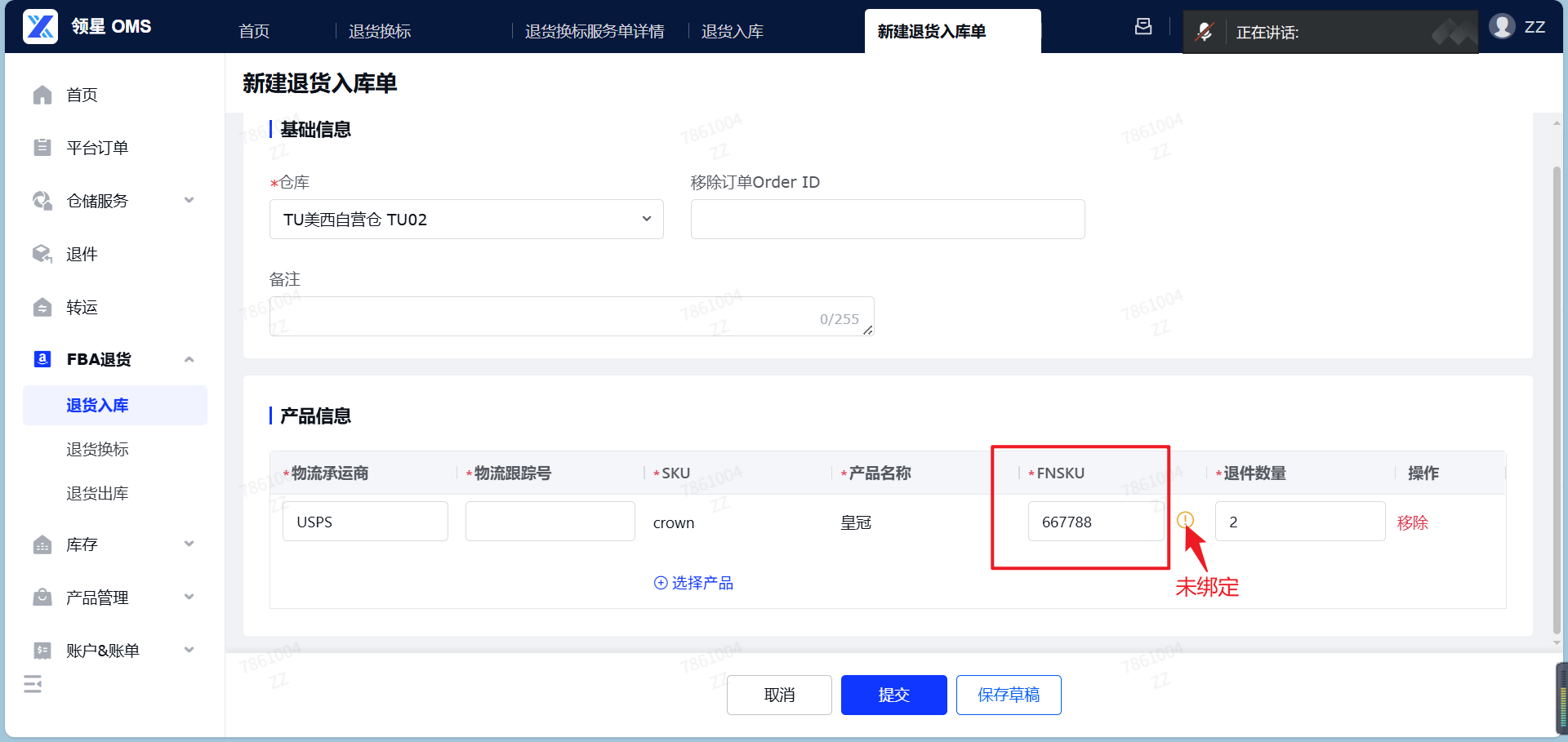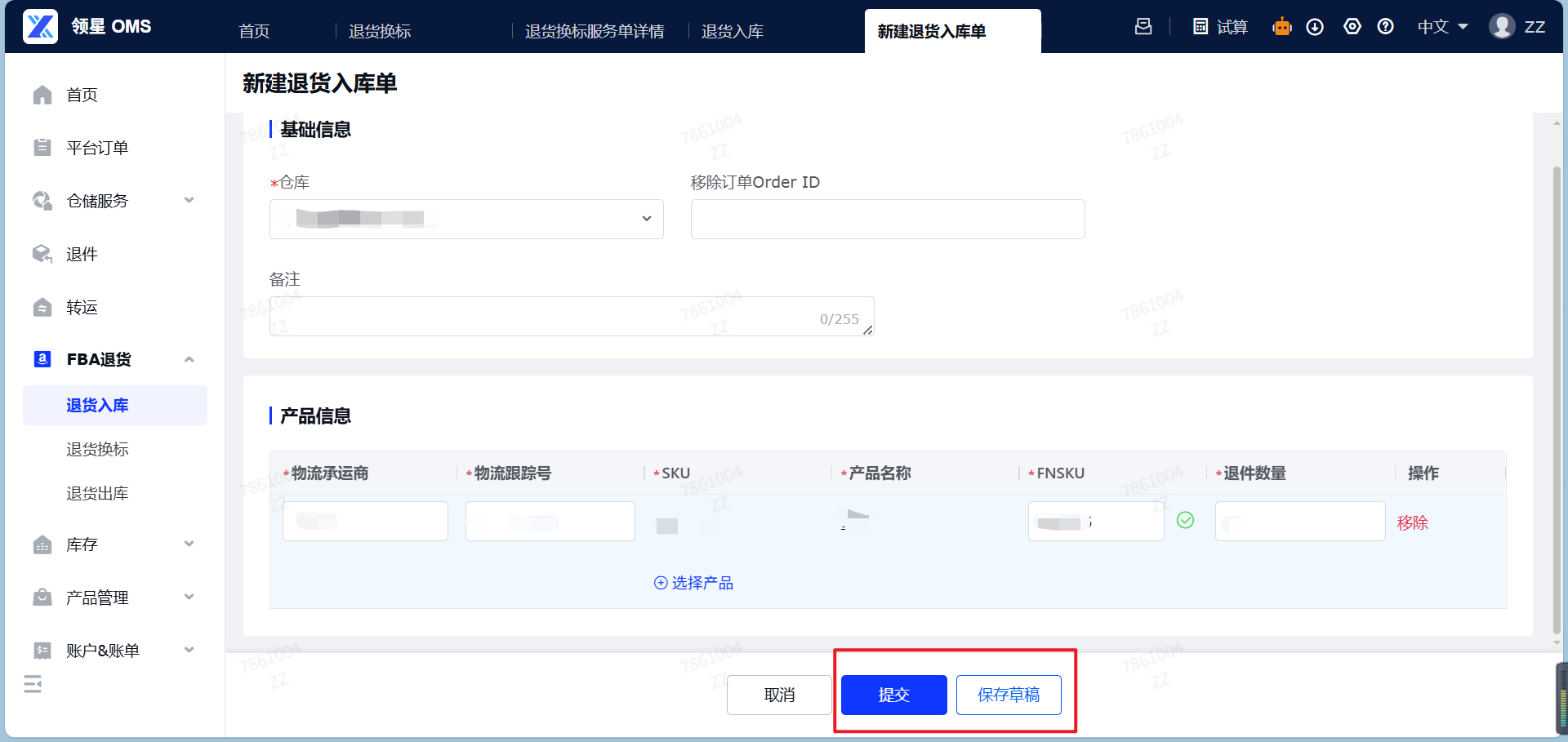 (5)提交FBA退货入库单:信息确认无误后,即可提交该FBA入库单,也可以选择保存草稿,保存草稿暂存单据信息,会进入草稿状态。