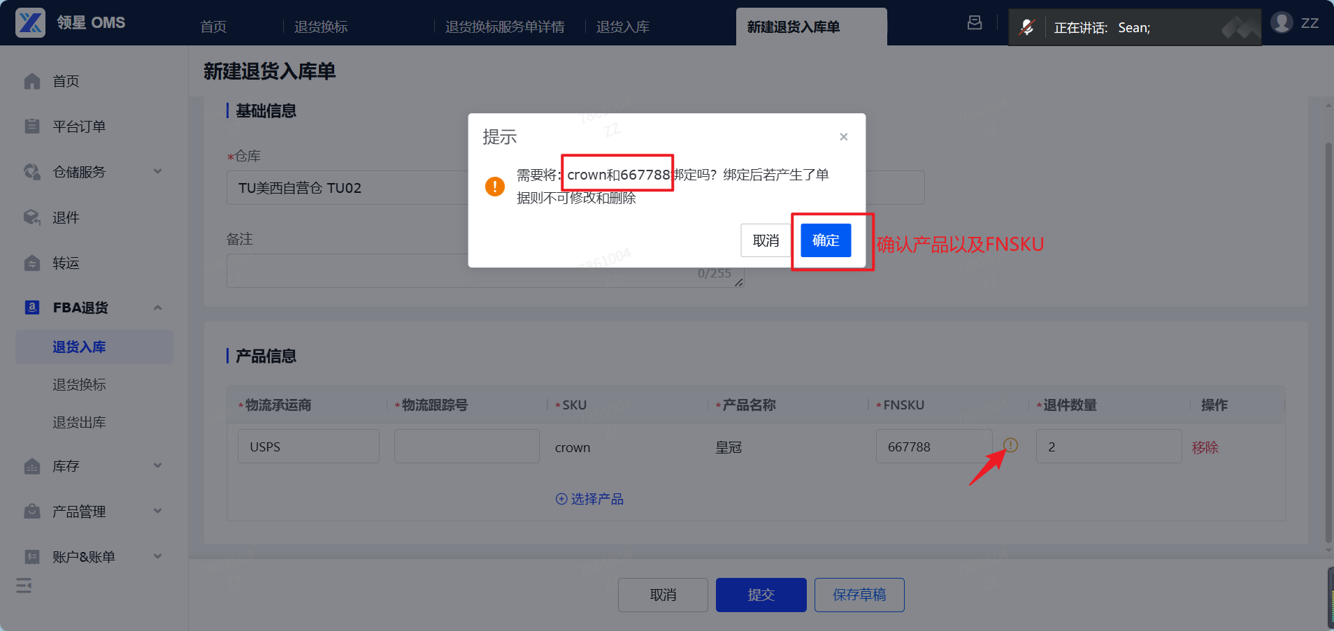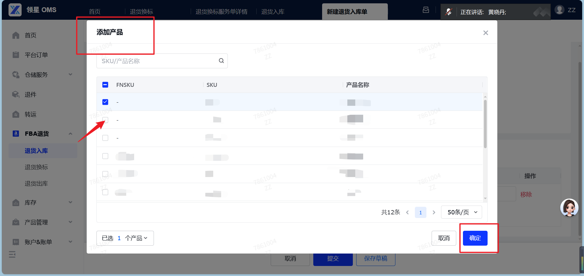(4)添加产品信息:填写退货包裹的物流承运商和物流跟踪号。点击选择产品,逐个勾选本次FBA退货的目标产品。选已绑定的 FNSKU 直接用;也可以直接填写未绑定的FNSKU,填完右侧会出橙色感叹号 。点感叹号,系统弹框提示 ,确认无误点 确定。填写退件产品的数量。