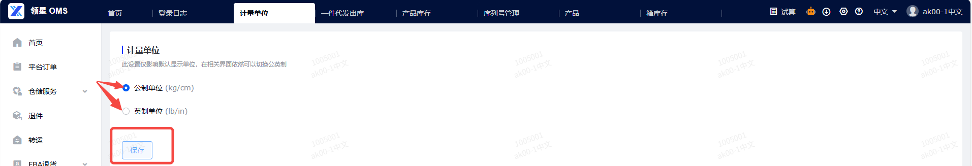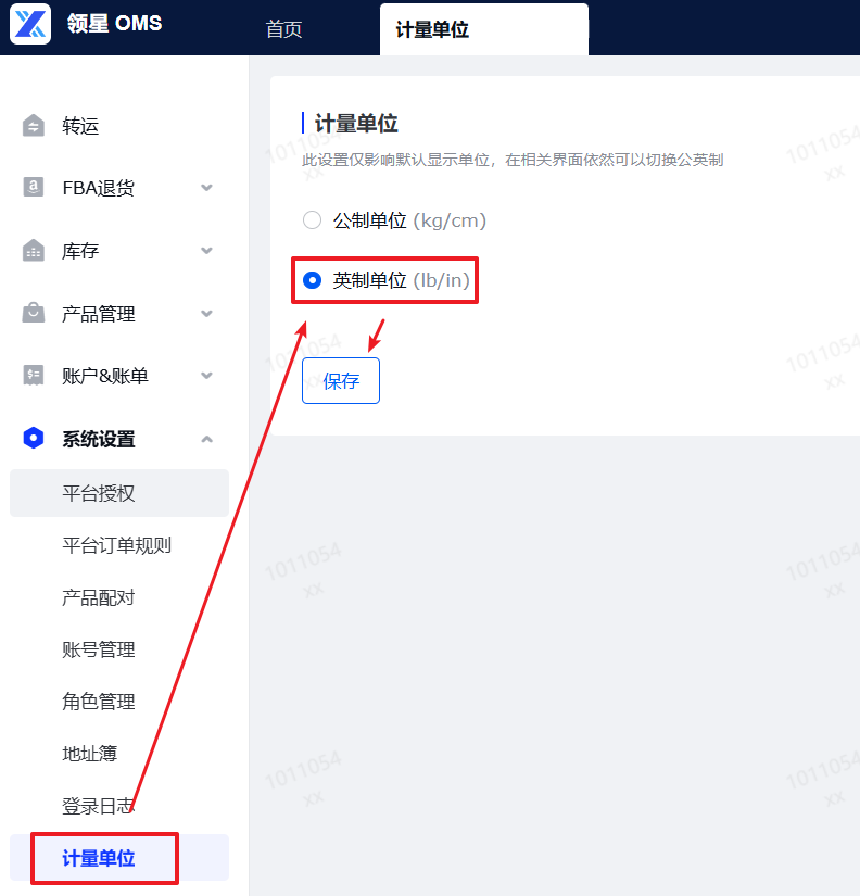 (2)点击计量单位:进入计量单位页面即可切换公制单位和英制单位,选择好后点击保存即可生效。