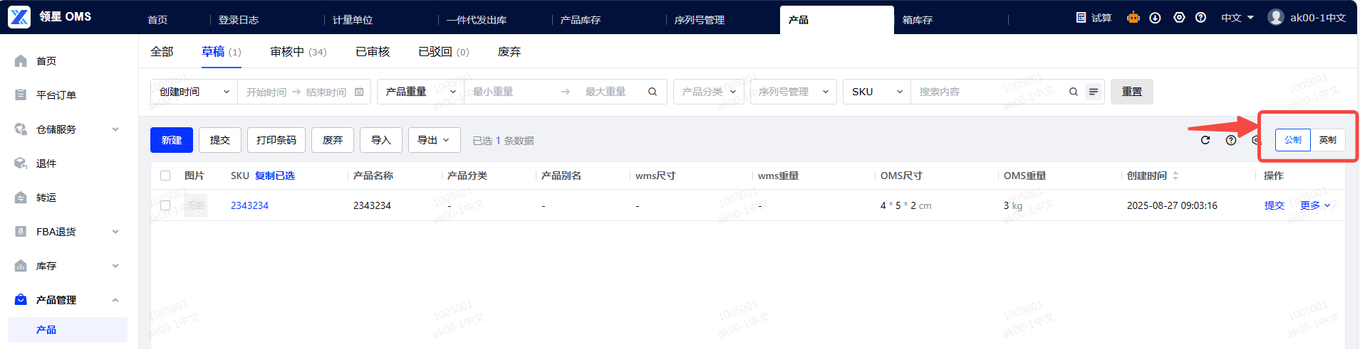 (1)局部灵活切换:即便设置了默认的计量单位,在部分相关界面仍然可以切换公 / 英制 ,比如OMS-产品管理-产品位置