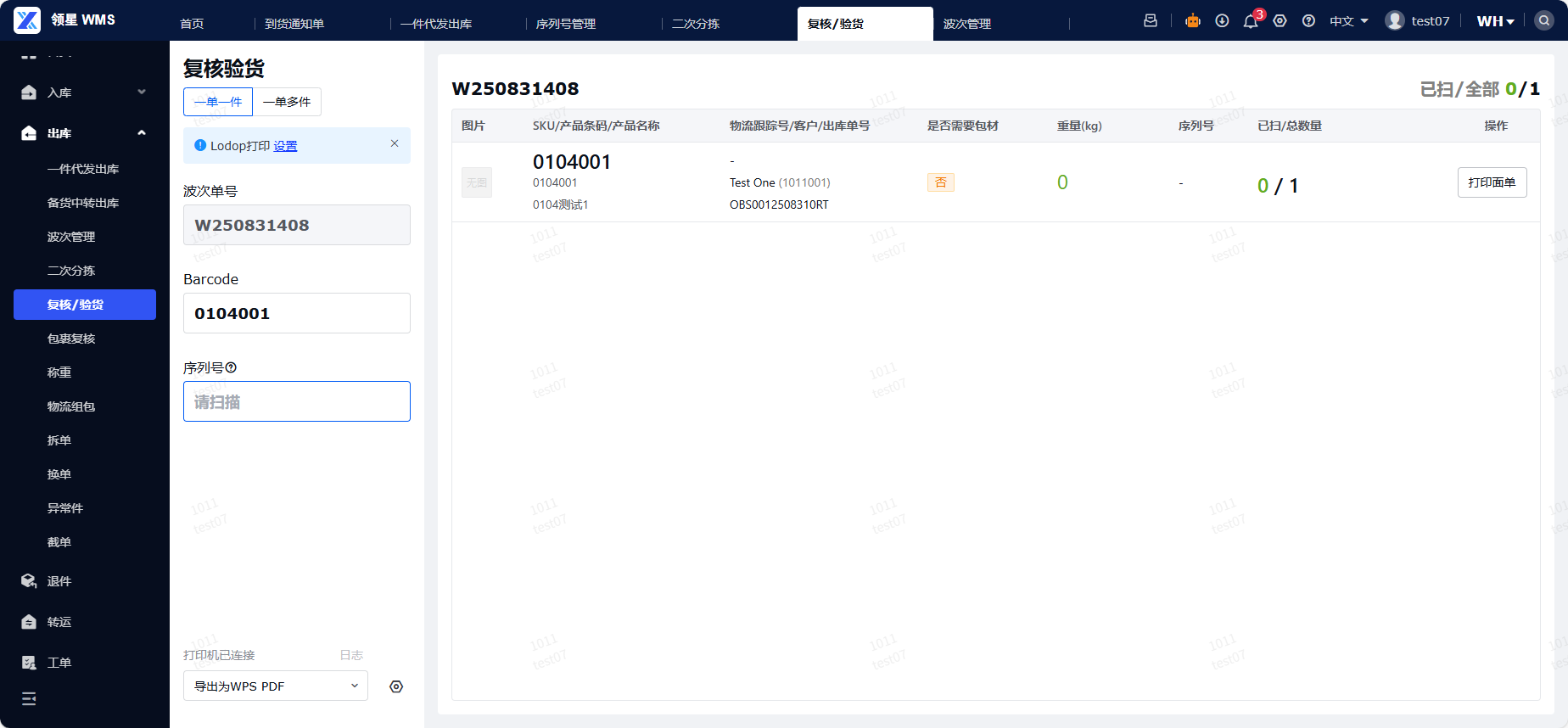 (4)复核验货绑定序列号:若订单中存在需要绑定序列号的SKU,并且已打开序列号管理,在做复核验货时,扫描该SKU,系统会弹出序列号扫描弹窗,需要完成序列号扫描,系统才会记录复核验货完成。