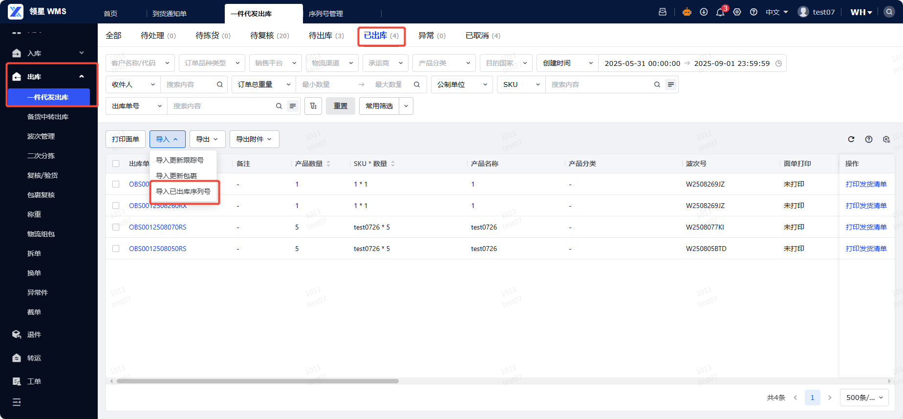 (3)出库采集序列号:出库采集可以分为以下两种模式,一是导入序列号,二是在二次分拣或者复核验货过程中将序列号与SKU进行绑定。