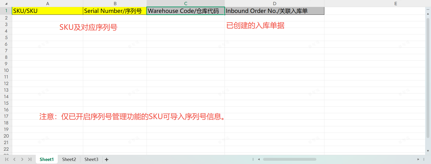 - OMS端:如果卖家在某批商品入库前已有该批商品的序列号信息,可提前将序列号信息导入系统,方便后续仓库在录入序列号信息时与卖家录入的序列号信息进行比对。卖家在OMS-仓储服务-入库页面,正常新建并提交入库单后,到产品管理--产品管理-序列号管理页面导入对应入库单的序列号信息。注意:仅已开启序列号管理功能的SKU可导入序列号信息。模板填写内容如下图所示。