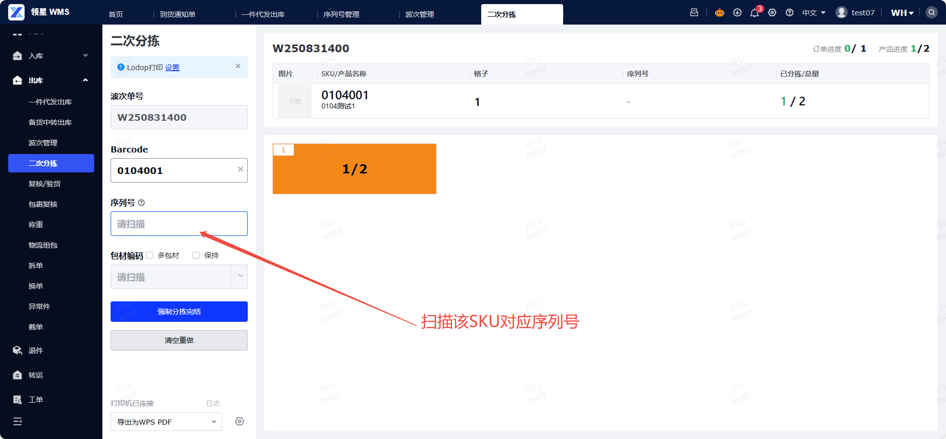 若订单中存在需要绑定序列号的SKU,并且已打开序列号管理,在做二次分拣时,扫描该SKU,系统会弹出序列号扫描弹窗,需要完成序列号扫描,系统才会记录二次分拣完成。