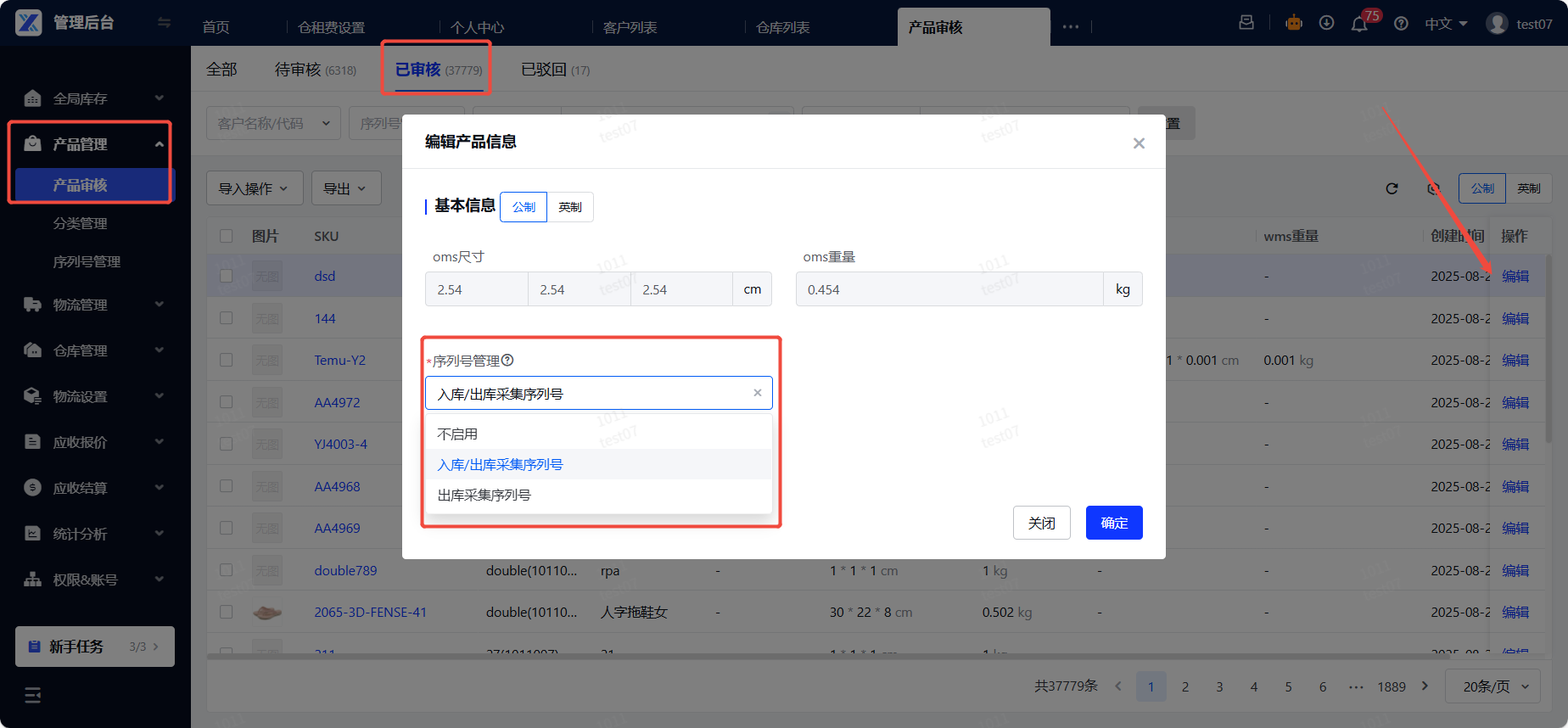 - 产品审核:指OMP端对客户已创建SKU进行审核,可进行编辑WMS尺寸、开启序列号绑定包材的操作。