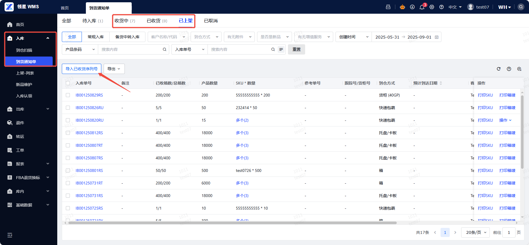 - WMS端:入库-到货通知单,收货中/已收货/已上架均可进行导入序列号操作。注意:如果SKU的序列号管理配置=出库采集序列号,可不操作该步骤。