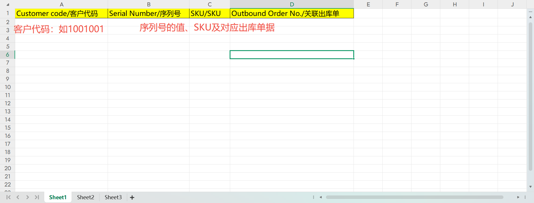已出库页面导入序列号:OMP-出库-一件代发出库-已出库-导入已出库序列号,模板如下: