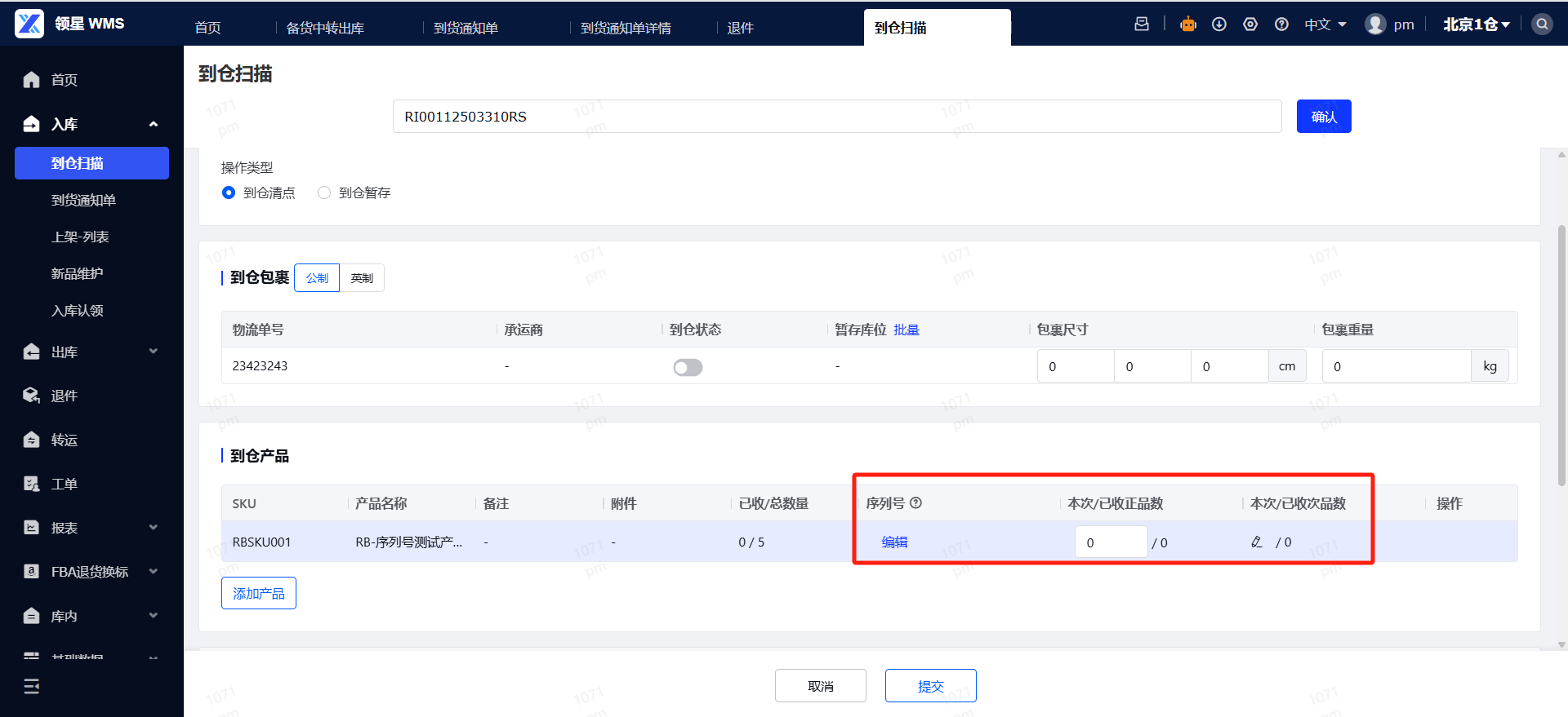 - PC端进行退件清点时,已开启序列号管理的SKU需要录入序列号进行清点。注意:本次已收正品+次品数需要等于录入的序列号数量。