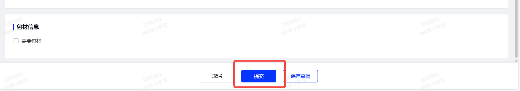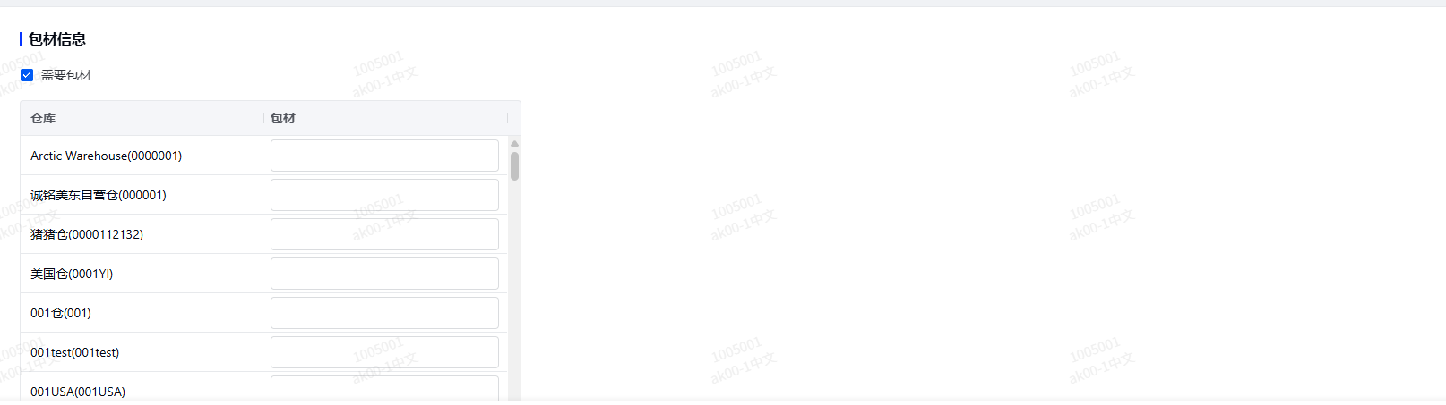 ⑤勾选包材信息:包材信息中可绑定仓库端创建的推荐包材,绑定后会在WMS端实际操作绑定的页面展示,起到信息提示的作用。