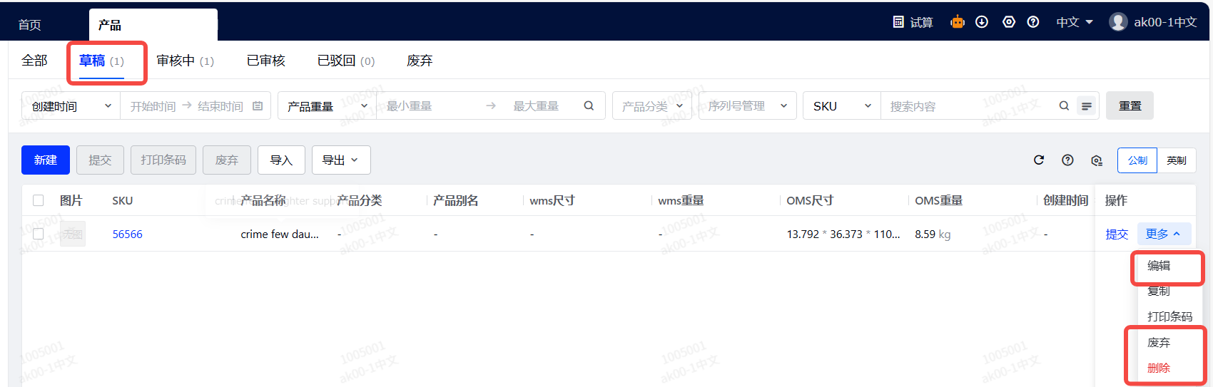 草稿:创建产品时点击“保存草稿”,就会显示在“草稿”状态。此时产品还未提交到仓库方审核,支持编辑、提交、废弃、删除。