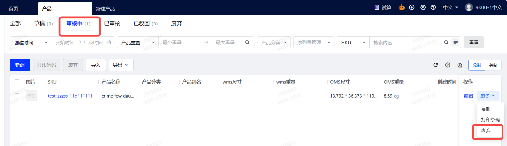 审核中:产品已提交至仓库方审核,但还未审核完成。支持编辑、废弃,废弃后可删除。