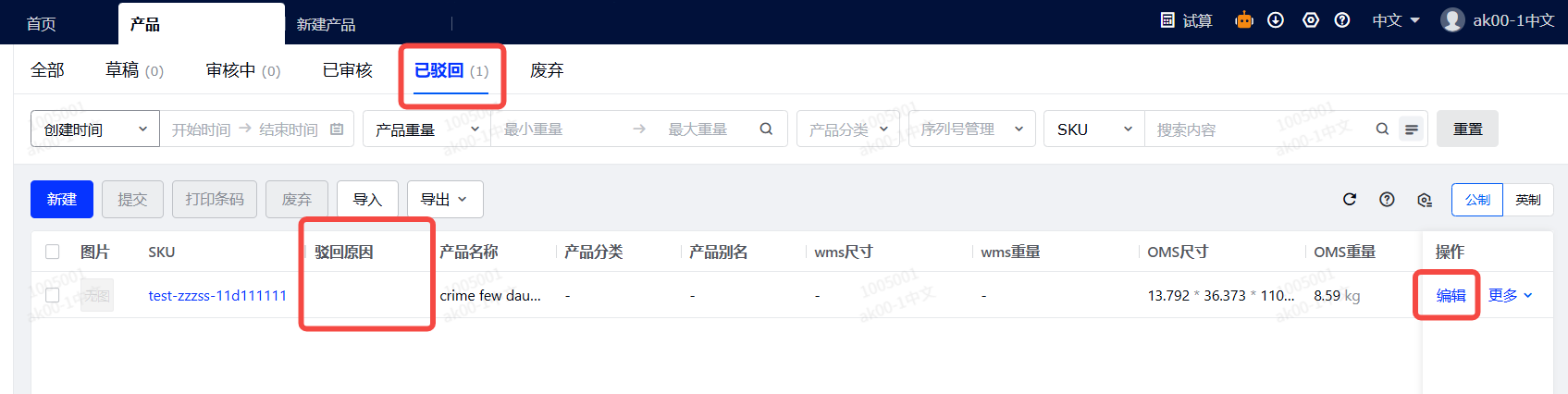已驳回:仓库方驳回了该产品的审核请求,并返回驳回原因,可根据原因进行编辑并重新提交,也支持废弃,废弃后可删除。