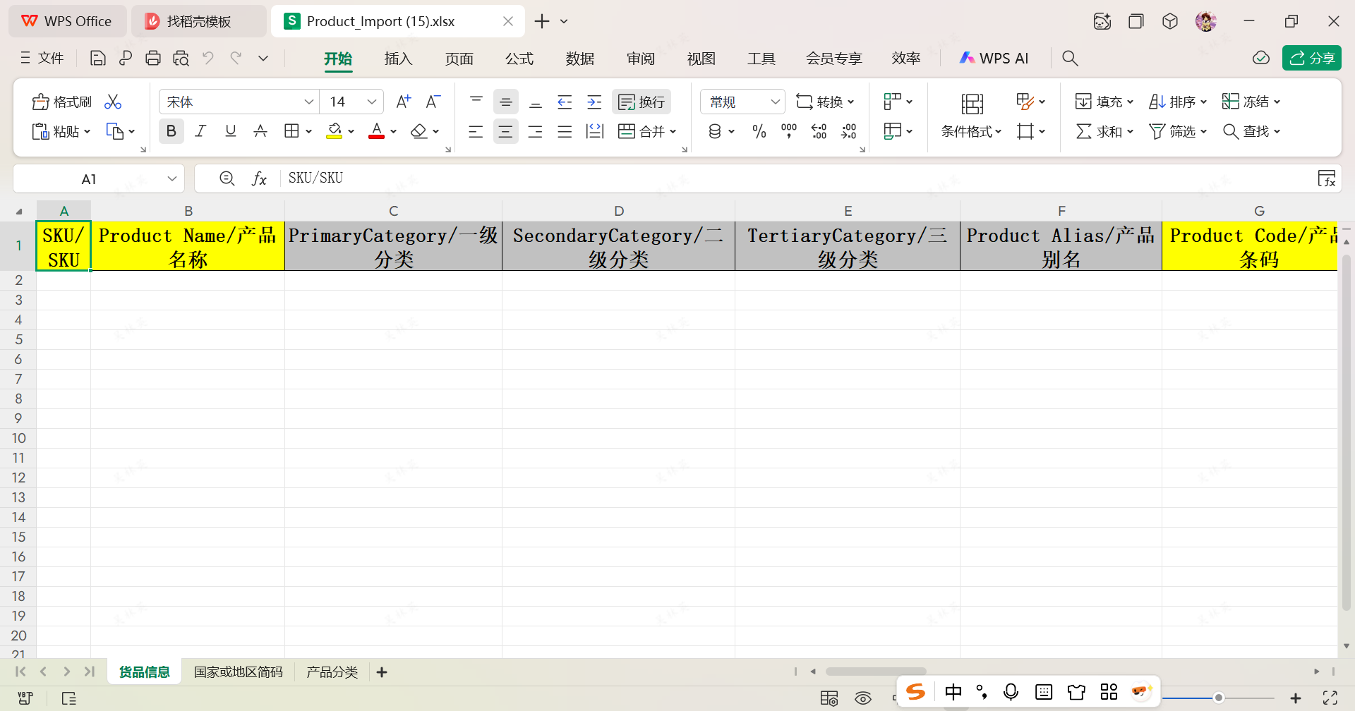 将产品信息填入表格中,一行为一个产品,黄色表头为必填信息。