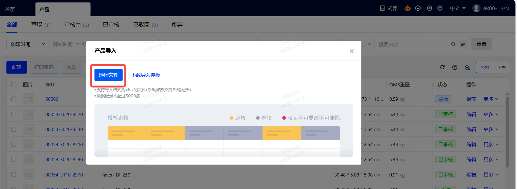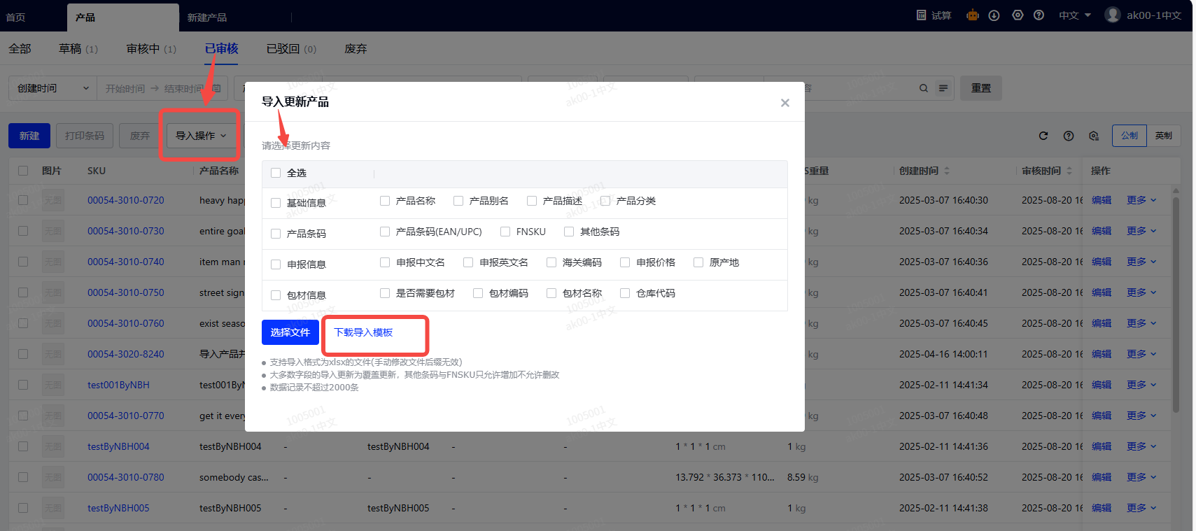 在“已审核”状态,可导入更新产品信息,选择需要更新的内容,下载模板后填写产品信息并导入。