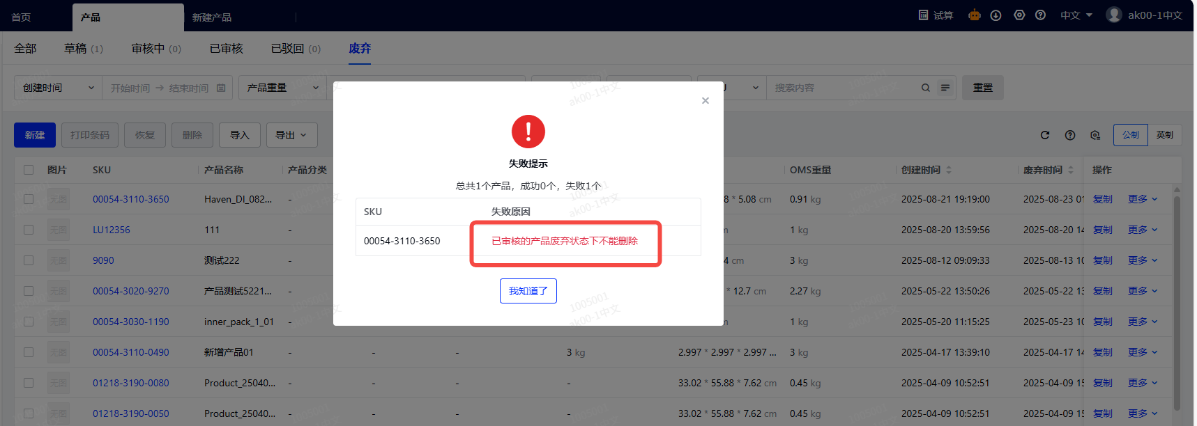 ①状态为“草稿”状态的产品可删除,也可废弃。