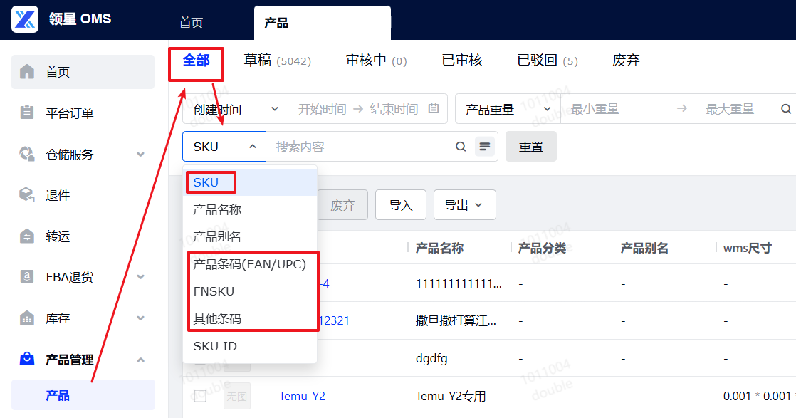 答:若客户之前创建过的产品,使用了与该SKU同名的产品条码/其他条码/FNSKU,也会提示【SKU已被使用】。可以在OMS-产品-全部,通过按【产品条码】/【其他条码】/【FNSKU】搜索该SKU,确认是否已存在于系统。
