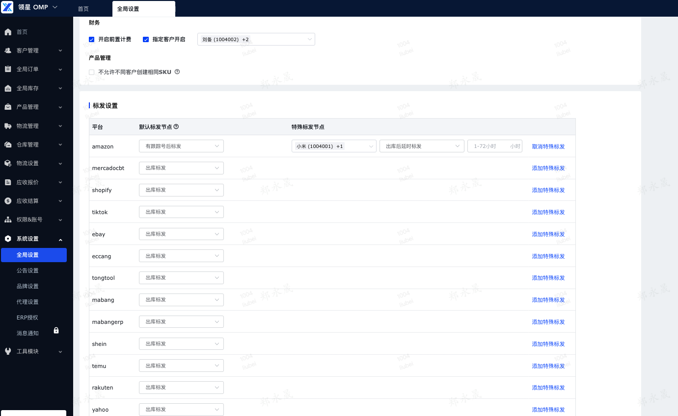 特殊标发节点:有部分客户可能有特殊需求,系统也支持针对部分客户设置单独的标发节点。例如图中,amazon的默认标发节点为有跟踪号标发,并设置了特殊标发节点:小米(1004001)为出库后延时标发(1小时),则针对【小米】客户的Amazon平台订单,将在订单出库后的1小时向平台标记发货;针对除【小米】客户外的amazon平台订单,将在有跟踪号后标发
